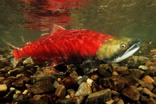 红大麻哈鱼是鲑科太平洋鲑属的一种鲑鱼,因在洄游的过程中身体会慢慢变红而得名,它们可以在第一次进入海洋的磁场中留下印记,然后使用同样的磁场来寻找原来的定位。