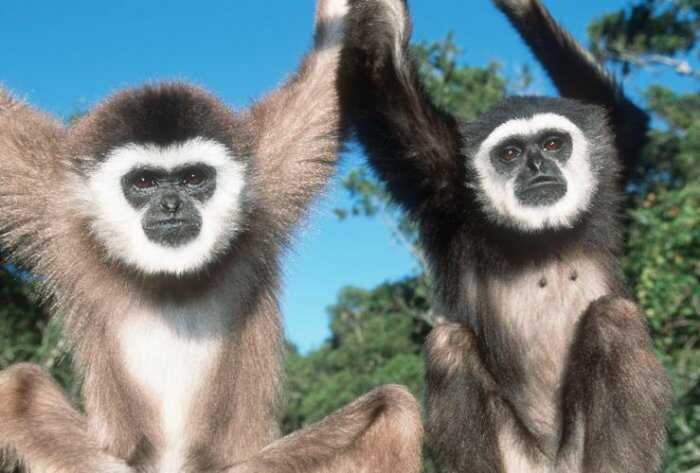 长臂猿的特点是身体纤瘦、四肢修长,手臂和腿部长度相当,能够以直立姿态行走,也善于跳跃和攀爬树木。头部圆形,面部无明显突出的鼻子,眼睛大而圆,嘴巴小而扁平。除了少数物种外,它们的毛发通常为棕色或黑色,身上没有斑点和条纹。长臂猿有一个突出的下巴和类似人类的面部特征,因此被认为是最像人类的动物之一。
