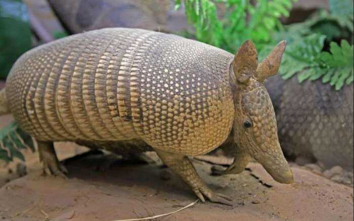 犰狳的身体特征主要包括身体呈锥形、四肢短小、腹部柔软且能卷曲成球状。它们的头部与身体相连较短,眼睛小而圆,嘴巴长而窄。犰狳有非常硬的鳞片覆盖全身,在面对威胁时会卷成一个坚不可摧的球来保护自身。犰狳的食性主要以昆虫和其他小型无脊椎动物为主。犰狳的面部特征与人类相似,有人说它们看起来像是穿着盔甲的小人。