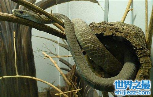 黑曼巴蛇 为眼镜蛇科的一员,是非洲最长、最可怕的毒蛇,也是全世界最致命的蛇。平均全长为2.5米(8.2 foot),最大可达4.48米(14.6 foot)。其名字中的“黑”字,其实是形容其乌黑的口腔而不是指其灰色或棕色的身体。