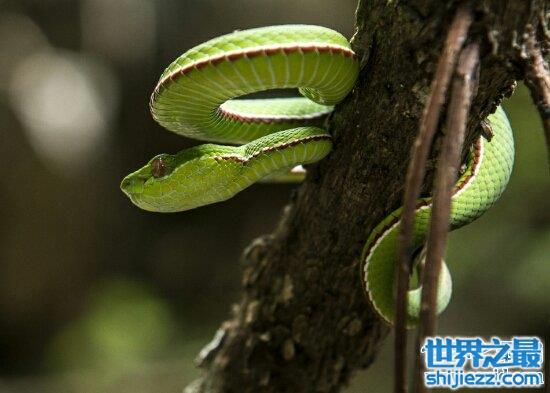 吉林长白山也曾经发现过竹叶青蛇,这种蛇全身都是绿色的,只有负面,还有尾巴是呈现黄色的眼睛和尾部都是呈现焦黄色的,它的体测有一条由白,红各半的和白色的贝林弄成的粽,头比较大,是呈现三角形的。竹叶青蛇的尾巴比较短,而且具有缠绕向头部和背部都有非常小的鳞片,这种竹叶青蛇被发现在海拔150到2000米的山区中,而且在竹林或者是草丛中也会发现竹叶青蛇。