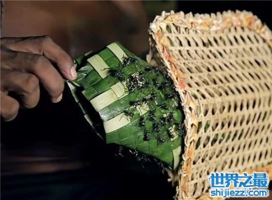在亚马逊部落中,当你成年了必须要经过子弹蚁的洗礼,不少人认为,被它们咬到就像是中了子弹一般,准备开始洗礼的时候,长者事先会收集好子弹蚁,下药放在手套中,药效消退,它们便开始变得狂躁。