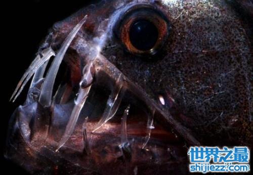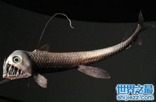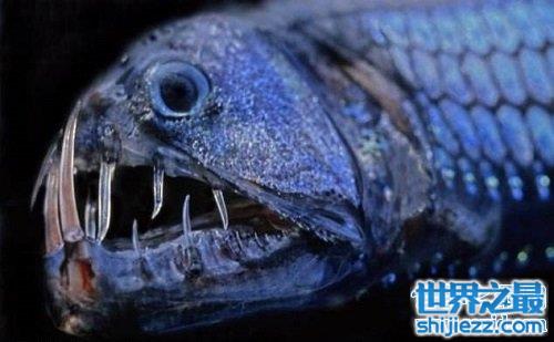 毒蛇鱼也被叫做蝰蛇鱼,它们主要生活在全球的热带至温带海域,它们是深海鱼。毒蛇鱼最大的特征就是牙齿很长很巨大,这牙齿酷似毒蛇的牙齿,又长又往外伸出。这毒蛇鱼是自带“光源”的鱼,它们身上具备很多发光器,因此能诱惑猎物投怀送抱。毒蛇鱼素有“深海猎手”的称号,因为它们可以捕食体型比自己庞大的动物,原因是它的胃部富有弹性。