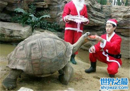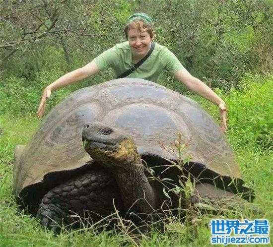 加拉帕戈斯象龟是现在记录的数据中最大的陆地龟,基本来说它的身体长度有1米多的长度,成年后,加拉帕戈斯象龟的雄性会长的比雌性要大的多,一个成年的雄性加拉帕戈斯象龟有300公斤左右,而雌性的估计也只有150公斤左右。而龟类的寿命没那么长,也就200岁左右。