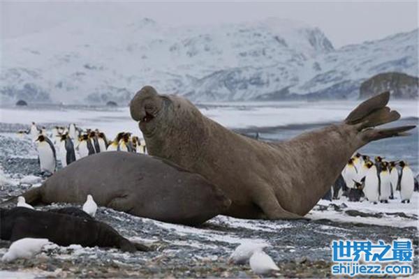 海豹是分布最广的鳍足类动物,从南极到北极都有它们的存在,它们共有11种。那在众多的海豹中,你知道世界上最大的海豹是什么?下面巴拉排行榜网小编带你们来认识下世界上最大的海豹是南象海豹,体长可达6米,比世界上最大的熊的2倍还多。别看它们体躯巨大肥胖,但是身体却十分柔软,头部可以向背后弯曲超过90度。