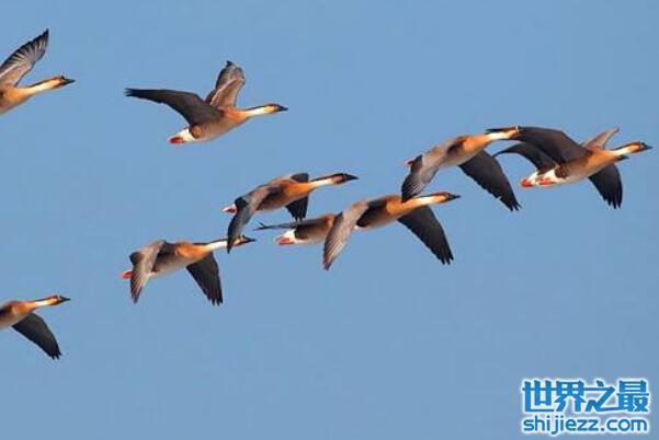 大雁是天鹅类大型候鸟,它们会六只组成一个雁队,或以6的倍数的数量组成一个雁队。它们会在飞行时通过热情的性情来给同伴鼓舞,或者利用叫声鼓励疲惫的同行同伴,它们在飞行过程中排成的人字形或一字型也是有道理的,这样有利于防御敌害。