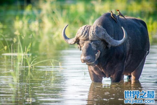 非洲野水牛是一种体长在2.1-3.4米的群居动物,通常牛群中强壮的公牛会成为族群的领袖,这种夜行性动物在白天通常会避开非洲草原上的烈日高温,并会躲在阴凉处或浸泡在水池中降低身体温度。