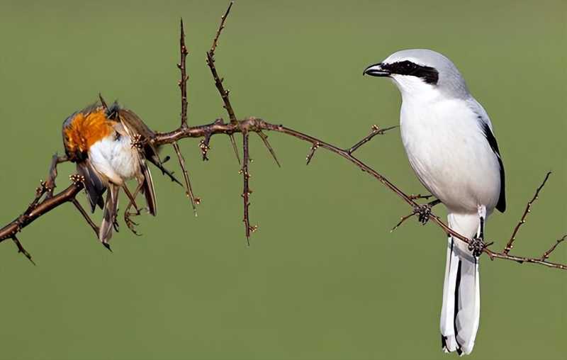 而“比礼招亲”的代表鸟类就是伯劳了,我们都知道伯劳鸟喜欢把猎物扎到针状植物上,这种做法的其中一个目的就是雄性伯劳用来求偶的,挂的猎物就是“聘礼”,猎物体型越大、越难捕获,越容易吸引到雌性伯劳。