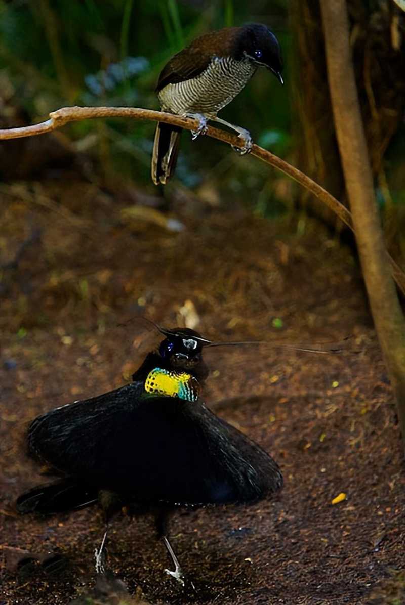 第三:优美的舞姿是关键。当打扫出“婚房”后,会有雌鸟前来光顾,雌鸟会停留在雄鸟附近的树藤上,此时重头戏来了-求偶舞。雄鸟会张开翅膀并其环抱起来,形成一个伞状,从上面看去就像是穿了一件芭蕾舞裙,之后,雄鸟的眼睛会由蓝色变为黄色,然后保持这个形态跳“芭蕾”,转圈、双腿走一根地面上凸起的树根,是检验一个“舞者”水平高低的重要标准。