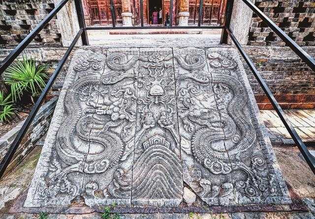大成殿的月台前,有一块雕刻着“二龙戏蜘蛛”的龙陛石。