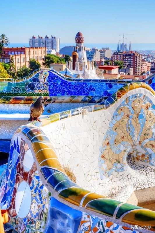 台阶两侧的波浪形长椅同样布满马赛克图案,像一条蜿蜒的彩色巨龙。