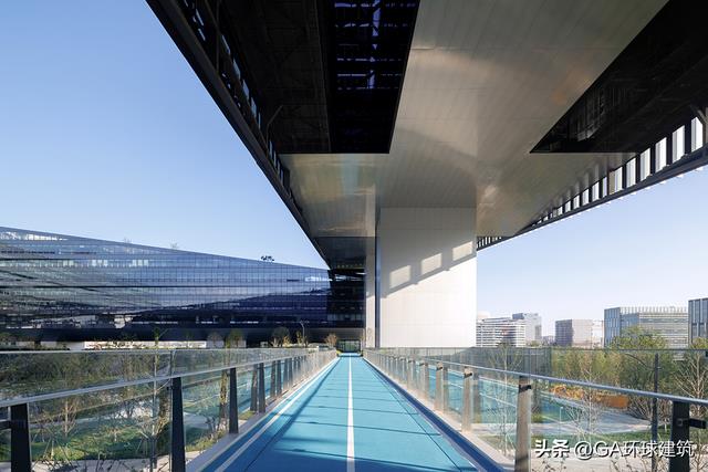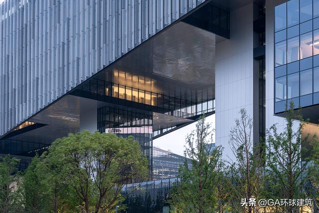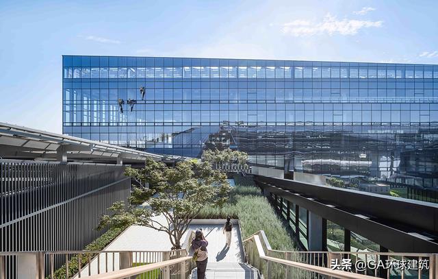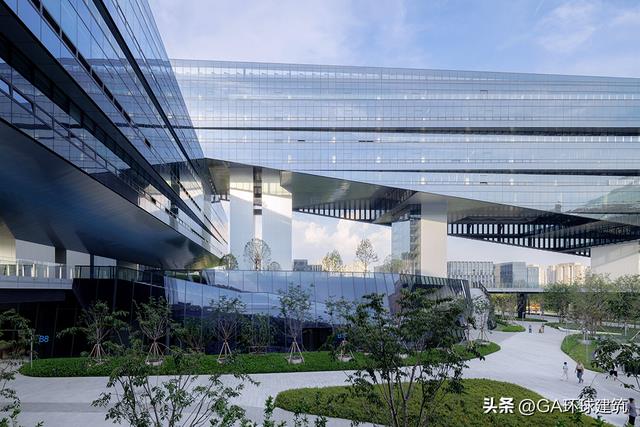 建筑底部设置四座不规则裙房,覆盖景观屋面形成“城市山丘”,并向公众全面开放近地空间,使城市道路、广场与景观自然交融。这种设计既消解了大体量建筑的压迫感,也实现了科技总部与城市生活的无缝衔接。