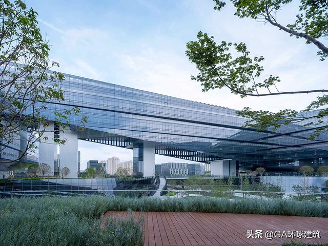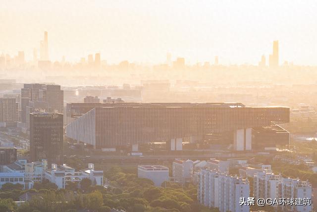 该建筑由北京市建筑设计研究院马泷工作室担纲设计。方案以“森林之上的科技公园”为核心理念,两栋L形塔楼相互嵌套,形成边长约240米的“回”字形超尺度环形建筑。建筑主体通过14个核心筒托举至空中,呈现“漂浮”于森林之上的视觉效果。