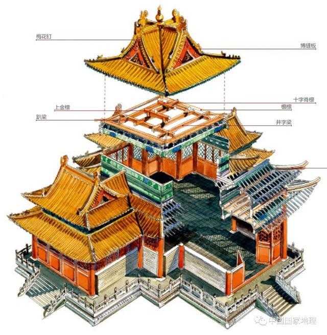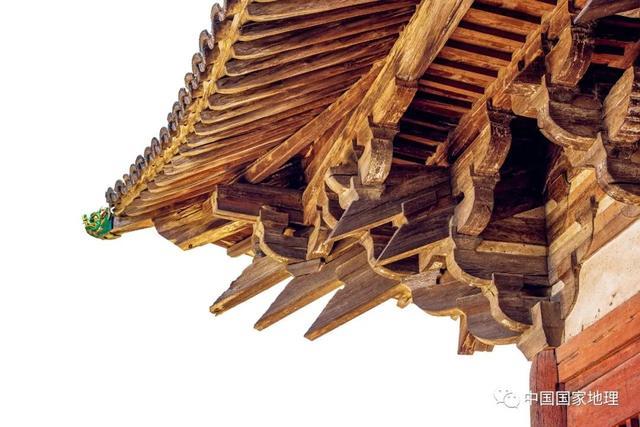 高大的屋顶在外能给人带来视觉上的冲击,是礼制的外化。屋顶之下,内部由横横竖竖的梁架支撑,像一套直角坐标系,为了遮风挡雨,应孕而生了角梁飞檐。翼角上翘、冲出,增加了整栋建筑的采光面,翼角突出的反曲向上,还能保持上部屋顶的坡度陡峭的同时,使雨雪被抛洒得更远,以减轻一角原本较大的力学荷载。