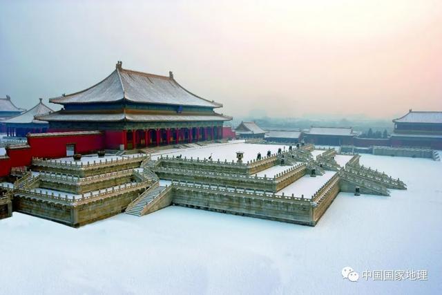 汉白玉台基托举着的太和殿壮美巍峨。台基由三层重迭的须弥座构成,俗称“三台”,台基丹陛下原有铜制的品极山,从正一品到从九品,十八个为一行,左右各两行。摄影 / 李少白