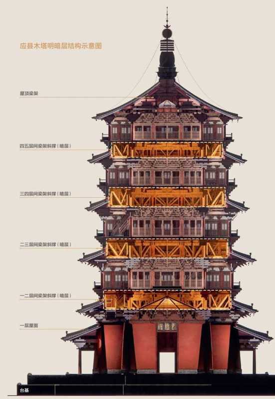 辽代应县佛宫寺释迦塔,有一个更通俗的名称叫应县木塔,高67.31米,是国内外现存最古老、最高大的纯木结构楼阁式建筑。盖这样的高层建筑除了应天时地利择高地、筑台,还需要通过复杂的内部结构来实现。