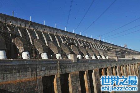 在与巴拉圭交界的巴拉那河上,有堪称世界第一的伊泰普大坝。大坝高225米,长8000米,所用混凝土达1180万立方米。用这些混凝土,可建一个供200万人居住的城市,或者建造一条从大坝通到美国纽约的高速公路。大坝修筑形成的伊泰普水库最高水位达233米,水库总容量290亿立方米。水电站的主机房高112米,长968米,宽99米,面积相当于四个足球场。
