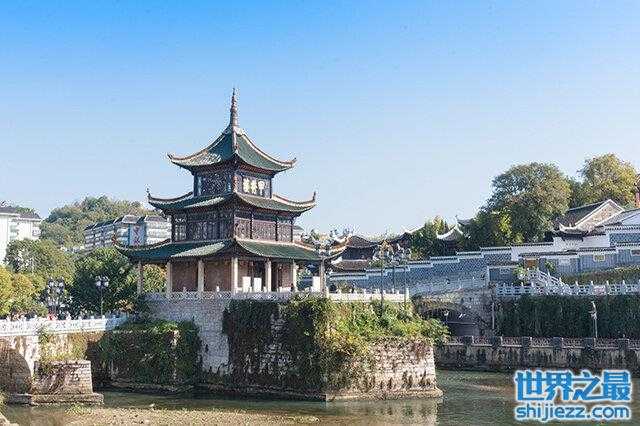 甲秀楼坐落于贵州省贵阳市市区内南明河中的一块巨石上,是一座三层三檐四角攒尖顶阁楼,景区主要分为三部分,即浮玉桥、甲秀楼、翠微园。甲秀楼始建于明万历二十六年(1598年),历代屡加修葺,现存建筑为清宣统元年(1909年)重建遗存,曾改名为“来凤阁”。甲秀楼分上下三层,均以白石为栏,飞甍翘角,层层收进,由桥面至楼顶高约20米,护以白色雕花石栏杆,楼侧由石拱“浮玉桥”连接两岸。甲秀楼朱梁碧瓦,四周水光山色,名实相符,堪称甲秀,集山光水色为一体的甲秀楼有一种独具魅力的美,绝对是中国最美城市古建筑之一。