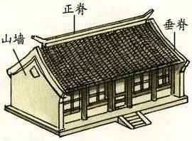 硬山顶,等级最低,两坡出水的五脊二坡式,由一条正脊和四条垂脊组成。与悬山顶不同,硬山顶两侧山墙把檩头全部包封住,由于其屋檐不出山墙,故名硬山。