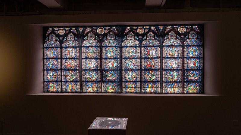展览现场,展墙上印着巴黎圣母院的花窗