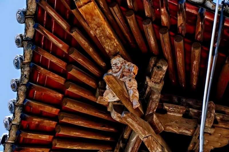 古建筑转角铺作的由昂之上,需要有一个构件承托大角梁,这个构件常常会做成力士的形态,这就是“角神”。由于力士的力气很大,因而能够承托起古建筑硕大的屋顶,与屋顶鱼尾鸱吻象征防火一样,角神也同样是一个寄托了象征意义的构件。