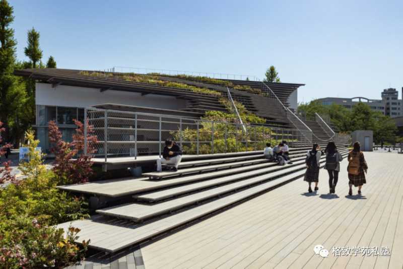 这是上面提到的日本建筑界大师之一 —— 隈研吾为东京工业大学打造的「看台下的学生活动中心」,也就是hisao & hiroko taki 广场,位置在东工大的入口处,是隈研吾事务所为东工大设计打造的全新校园广场,也是为学生们设置的活动平台。