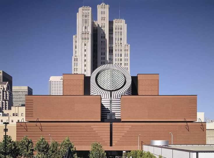 旧金山现代艺术博物馆(San Francisco Museum of Modern Art),建于1935年,由瑞士建筑设计师马里奥·博塔设计,最突出的特征是一个高38公尺的圆柱形斑马纹大天窗,光线可直接由楼顶照射到底楼,采光良好。环绕周围的是铺有红褐色调的面砖,完全对称的正立面洋溢着古典建筑中才能见到的那种沉稳情调。由于博物馆所处的地块三面被高层建筑包围,这使得他的作品在周围一群灰白色的物体中显得尤为突出。