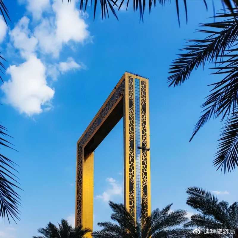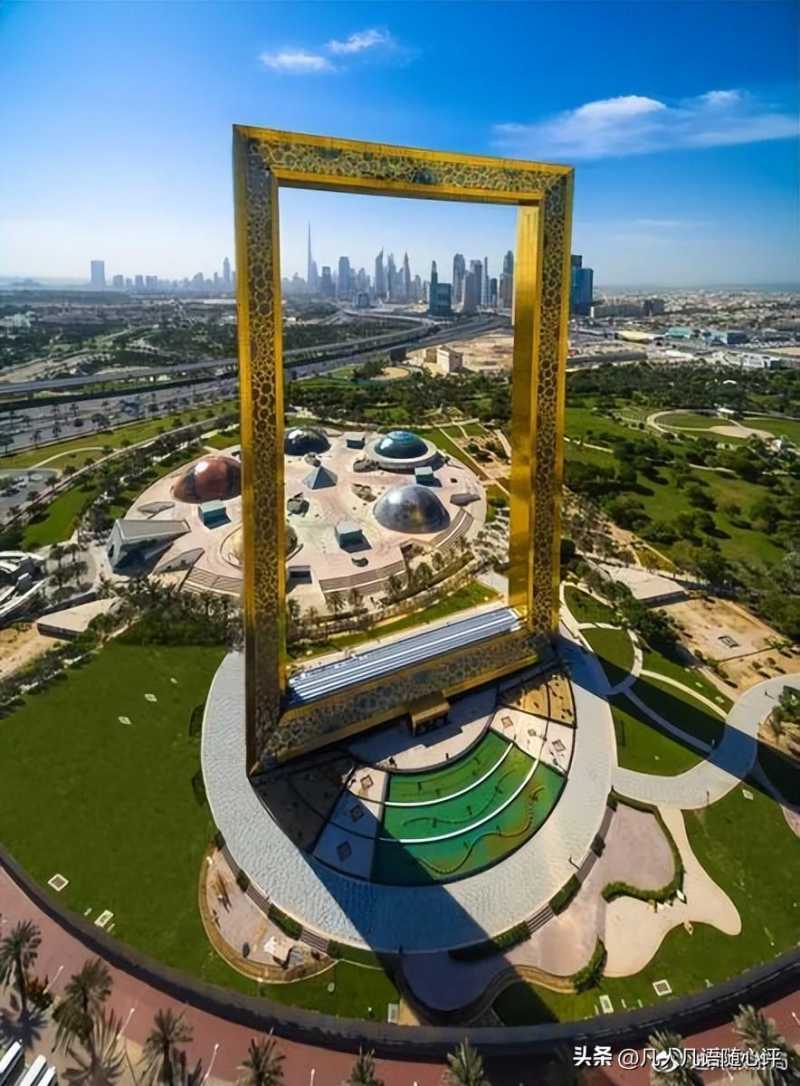 迪拜相框高150.23米,宽95.53米,坐落在迪拜扎比尔公园,这座建筑使用了2000吨钢材,表层还进行了15000平方米的镀金层,使她无论何时都能格外靓丽。夜晚时分,还会有七彩的装饰灯将整个相框点亮。迪拜相框于2018年1月1日在迪拜落成,现在她已经成为迪拜的网红地标。