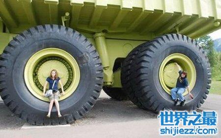 别拉斯-75710,高8.16米,宽9.87米,长20.60米,自重360吨,载重能力高达450吨,810吨的满载重量超过一辆满载的A380客机。这是目前世界上载重量最大的自卸卡车。站在它旁边,除非你至少有2米高,否则你连其半个轮子的高度都达不到。