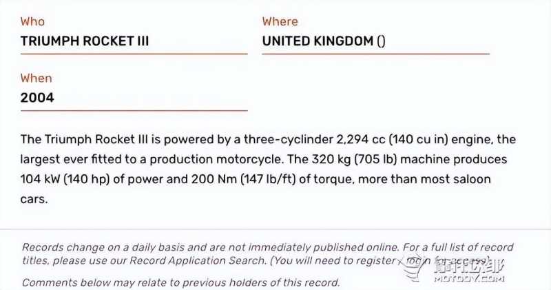 说起火箭3,大家都知道它以2458cc的三缸发动机在摩托车圈称王称霸,排量就是大,不过凯旋拿去申请吉尼斯世界纪录的火箭3并不是我们所熟知的新款火箭3,而是在2004年初次发布的、排量为2294cc的初代火箭III。