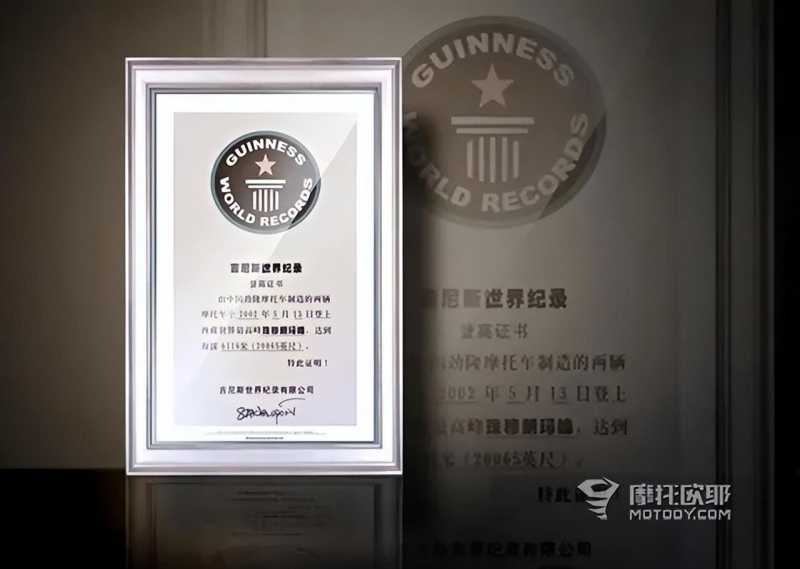 答案一定是有的,遗憾的是我能找到的最早纪录,只有2002年劲隆摩托攀登珠峰时所创下的纪录,当时的车手为陈建国和徐焕金,他们骑着劲隆摩托爬升到6116米海拔的成绩,也被真正的吉尼斯世界纪录有限公司记载并认可,这个纪录是世界性质的,和“大世界基尼斯”不是一个水平,和“中国电视吉尼斯”也不是一个水平。