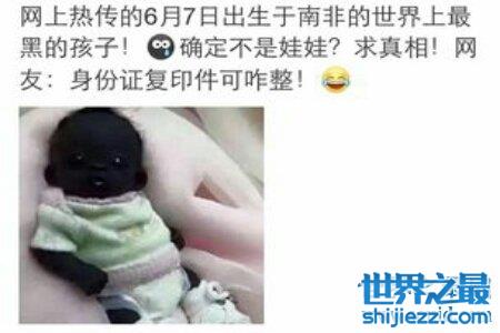 世界上最黑的小孩,2015年6月7日出生于南非。2015年6月12日,一张名为"世界上最黑的孩子"的照片在"推特"、"脸书"等社交媒体上传播。这名婴儿2015年6月7日出生于南非,见过这孩子的人都描述孩子是"至今为止还没有见过比他肤色更黑的孩子"。从照片看,这名婴儿出生不久,长着一些头发,有一双圆圆的汪汪大眼,黑眼球大到几乎看不到眼白,因此皮肤、头发、眼睛、嘴唇都是黑的。