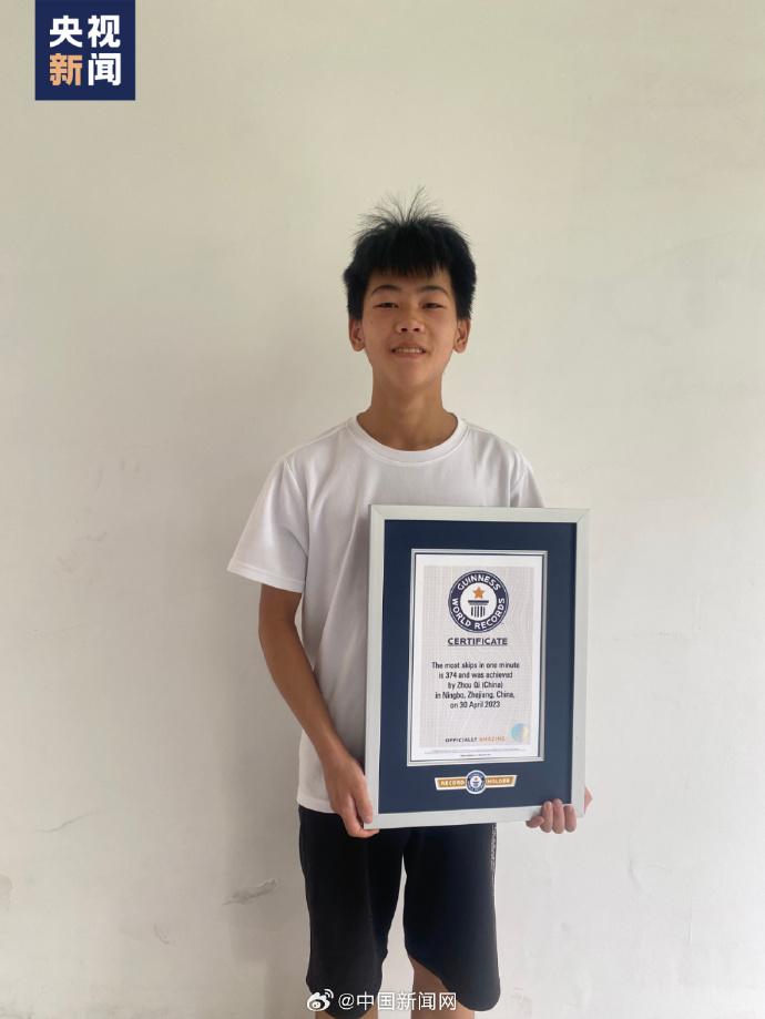 中国新闻网援引央视新闻报道,近日,浙江余姚16岁少年周琦收到了吉尼斯世界纪录证书,成为当前“1分钟跳绳次数最多”的人。