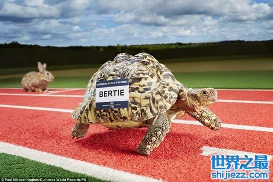 2014年7月9日,来自英国名为“Bertie”的乌龟爬行速度达到0.28米/秒,成为世界上爬行最快的乌龟。Bertie爬行速度大约是一般乌龟平均爬行速度的两倍,他还可以在6分钟内爬行100米,在龟兔赛跑中,再也不会输给兔子了(当然了这只是个玩笑)。后来他的主人Marco和Janine Calzini注意到了他的特别才华。Marco介绍道:“Bertie现在和她的女朋友Shelly幸福地生活在豪华的‘家’,他的吉尼斯世界纪录证书赫然陈列于墙上。能够被录入这本书中,简直就是梦想成真的感觉!”这只出色的乌龟还有一个可爱的爱好,每次比赛前都要吃他最喜欢的零食草莓。