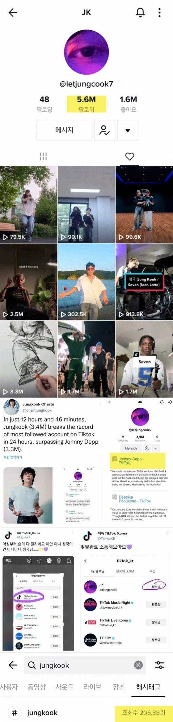 另一方面,柾国已经通过他的标签“#jungkook”在 TikTok 上拥有了大量的浏览量。截至8月3日,“#jungkook”在TikTok上的浏览量已达2068亿次,并连续28个月成为全球个人话题标签第一,证明了无与伦比的社交王者的力量。与此同时,柾国因与TikTok韩国官方账号形成“后续”而引起关注。