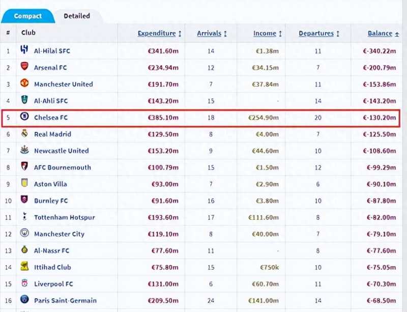 对于利雅得新月的疯狂引援,德国转会市场进行了统计,表示利雅得新月的净投入高居足坛所有球队第一位,甚至比切尔西还要多,后者买人花费3.85亿欧,再加上出售球员进账2.55亿欧,这样净投入变为1.30亿欧,还不如吉达国民、曼联、阿森纳,排名足坛第五。