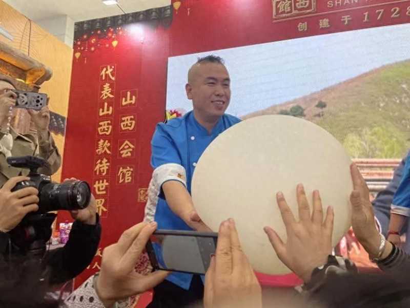 只见表演师傅王张龙脚蹬独轮车,头顶大面团,双手同时开弓削着面。短短一分钟内,削出了228刀面片,惹得观众一片喝彩。紧接着是关公扯面表演,王张龙手指舞动,上下翻飞,扯出的面条又宽又薄,还有韧劲。“早就听说山西不仅面食好,面食表演也很绝,真是百闻不如一见,太精彩了!”山东游客张琪挤在人群中观看着面食表演,非常兴奋。