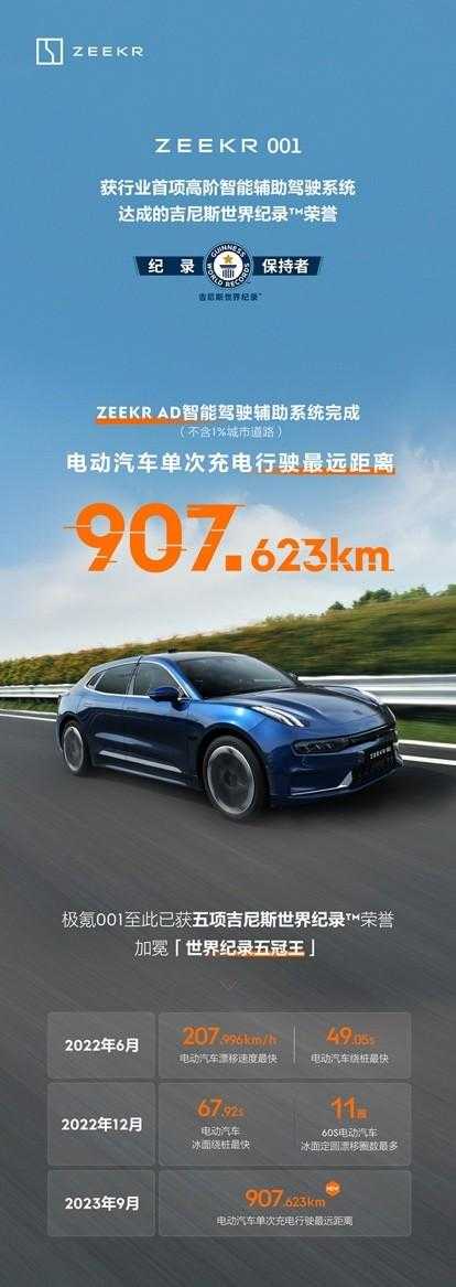 近日,极氪智能科技公布:全能猎装极氪001成功首创【电动汽车单次充电行驶最远距离 907.623km】吉尼斯世界纪录,这也是行业首个由高阶智能驾驶辅助系统完成的全新纪录;继四创吉尼斯纯电驾控类世界纪录之后,极氪001实力成就“五冠王”殊荣。此次挑战,严谨验证了极氪001纯电量产车型全球第一的续航实力,同时,ZEEKR AD智能驾驶辅助系统全程在安全行驶和高效通行上的稳定表现,也是对极氪成为智能化水平第一梯队的实力演绎。