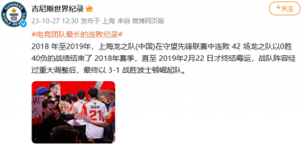 近日,吉尼斯世界纪录官方微博公布上海龙之队(中国)获电竞团队最长的连败纪录。2018年至2019年,上海龙之队(中国)在守望先锋联赛中连败42场龙之队以0胜40负的战绩结束了2018年赛季,直至 2019年2月22日才终结霉运,战队阵容经过重大调整后,最终以3-1战胜波士顿崛起队。