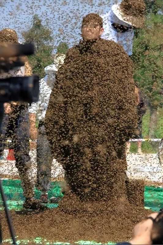 中国的阮良明在身上覆盖大约637000只蜜蜂,总重量约为63.5公斤。任何试图打破这一纪录的人做好被叮咬的准备