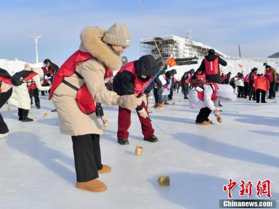 挑战者在冰面上玩陀螺。