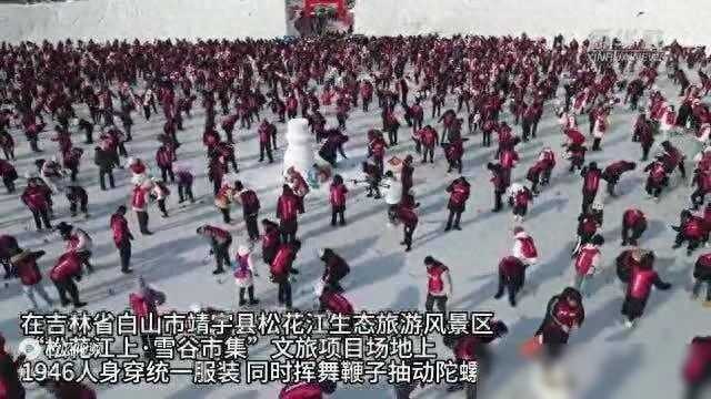 这场纪录创造发生在松花江生态旅游风景区的“松花江上·雪谷市集”文旅项目场地。身穿统一服装的1946名参与者聚集在一起,挥舞着手中的鞭子,犹如一支激昂的乐曲,将陀螺的旋律演绎得淋漓尽致。