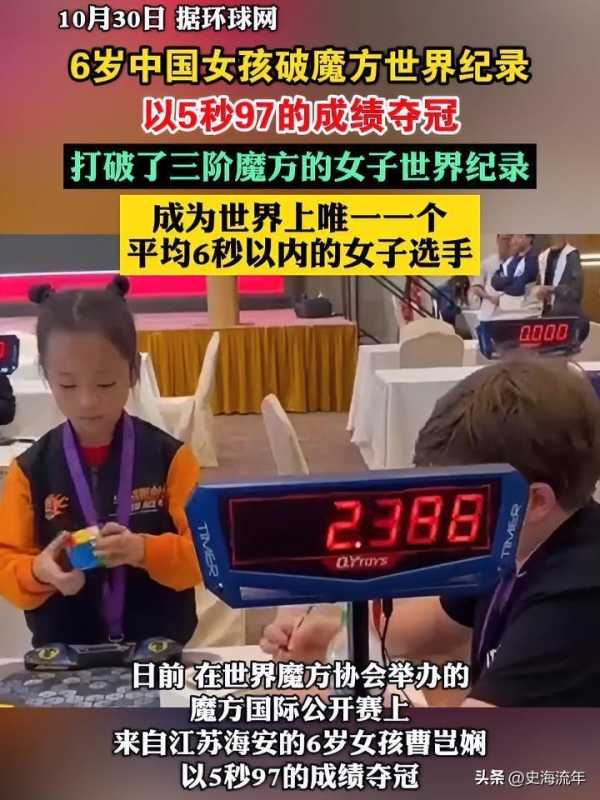 在江苏省海安市实验小学,一位名叫曹岂娴的一年级学生,以她7岁的年纪,连续打破了三阶魔方速拧项目的世界纪录,成为了世界上第一个平均6秒以内完成此项目的女子选手。她的成就不仅令人惊叹,更引发了我们对教育方式及教育改革的深思。