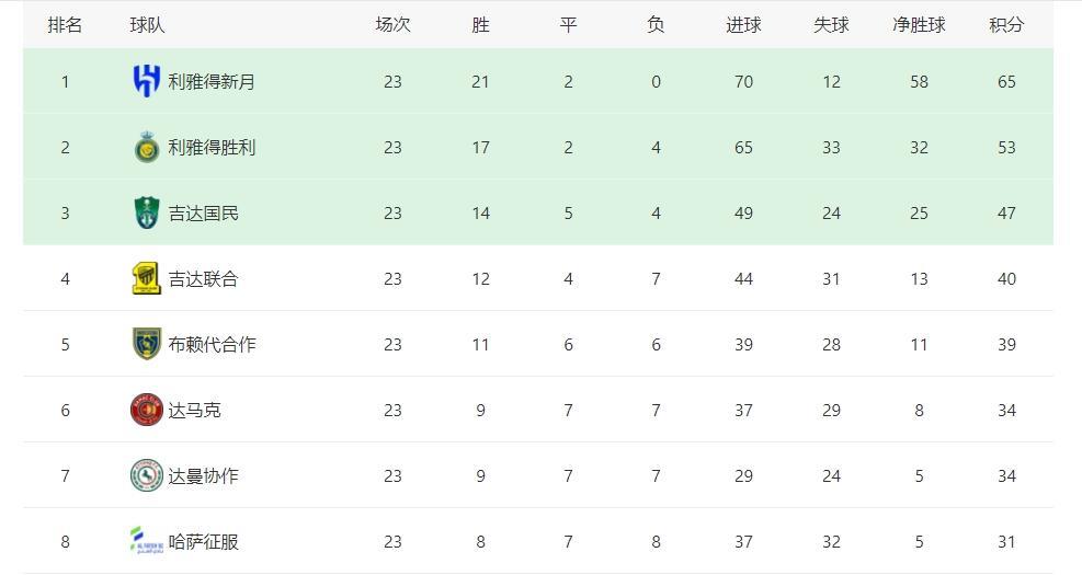 目前,利雅得新月在沙特超级联赛上以21胜2平的不败战绩断层领跑,目前已经领先第二名的利雅得胜利12分,夺得本赛季联赛冠军已经没有太大的悬念。在自己的28连胜期间,利雅得新月总共打入81个进球,仅丢8球,无论攻防两端都格外抢眼。目前,利雅得胜利在沙特超级联赛、亚冠、沙特国王杯上都保持着连胜势头,他们将在本赛季冲击这三项赛事的冠军。