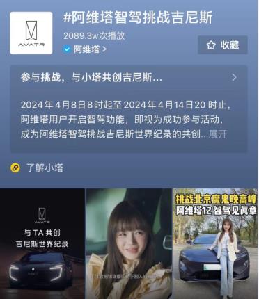 4月2日,阿维塔科技官方平台发出招募令,动员全国阿维塔车主,共同挑战智驾人数最多的吉尼斯世界纪录。按照规则,2024年4月8日18时起至2024年4月14日 20时止,凡阿维塔用户开智驾功能,即视为成功参与活动,成为一项新的吉尼斯世界纪录的共创人。