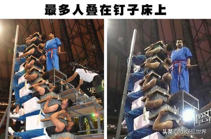 最多人叠在钉子床上,也是由印度三哥打破的,足足叠了9个人