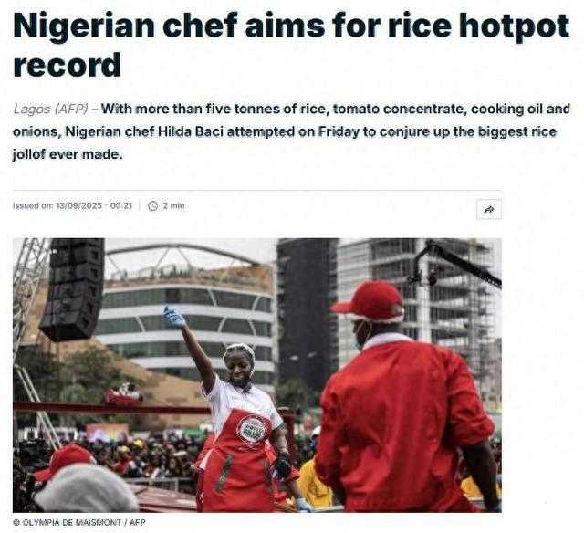 法新社近日报道,尼日利亚厨师希尔达·巴奇尝试制作世界上最大份的“乔洛夫米饭”,她用了五吨多的大米、番茄酱、食用油和洋葱等食材。