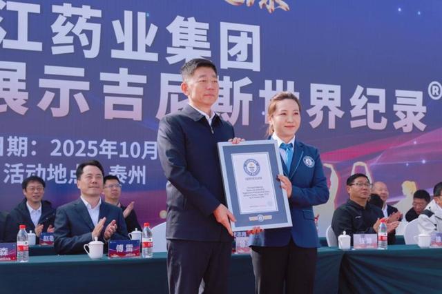 10月31日,扬子江药业集团党委书记、董事长、总裁徐浩宇接受“最大规模八段锦展示”吉尼斯世界纪录™称号认证。主办方供图