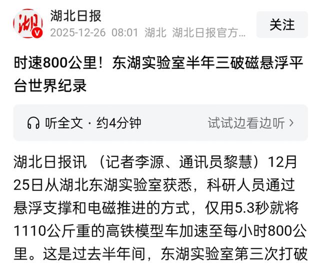 刚报道说时速700公里,这又提到800公里了!武汉东湖又创世界纪录 时间来到2025年年底了,我国磁悬浮技术团队又飙起了速度——12月25日和26日,磁悬浮科技圈上演了一场“速度接力赛”。《央视新闻》等媒体报道25日国防科技大学宣布在2秒内将吨级试验车加速至700公里/小时,刷新超导 ... 世界记录12-27