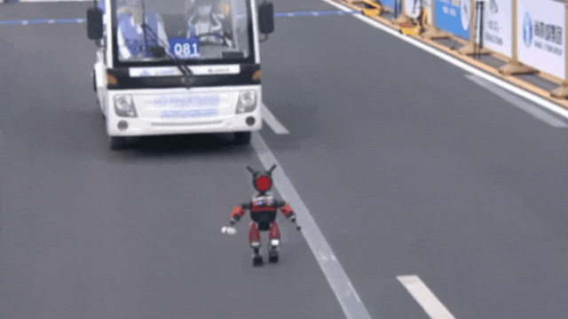 如果说去年的比赛更像一场“大型翻车现场”,不少机器人从刚起跑就接连倒地、零件一路掉落,那么今年的关键词则变成了“稳定”。那种“摔到解体”的场面几乎消失,最狼狈的情况,也不过是跑完全程的“独臂选手”。虽然磕绊难免,倒地难免,但许多机器人在跌倒后能迅速自主完成姿态调整,一个“鲤鱼打挺”又站了起来,继续向前。